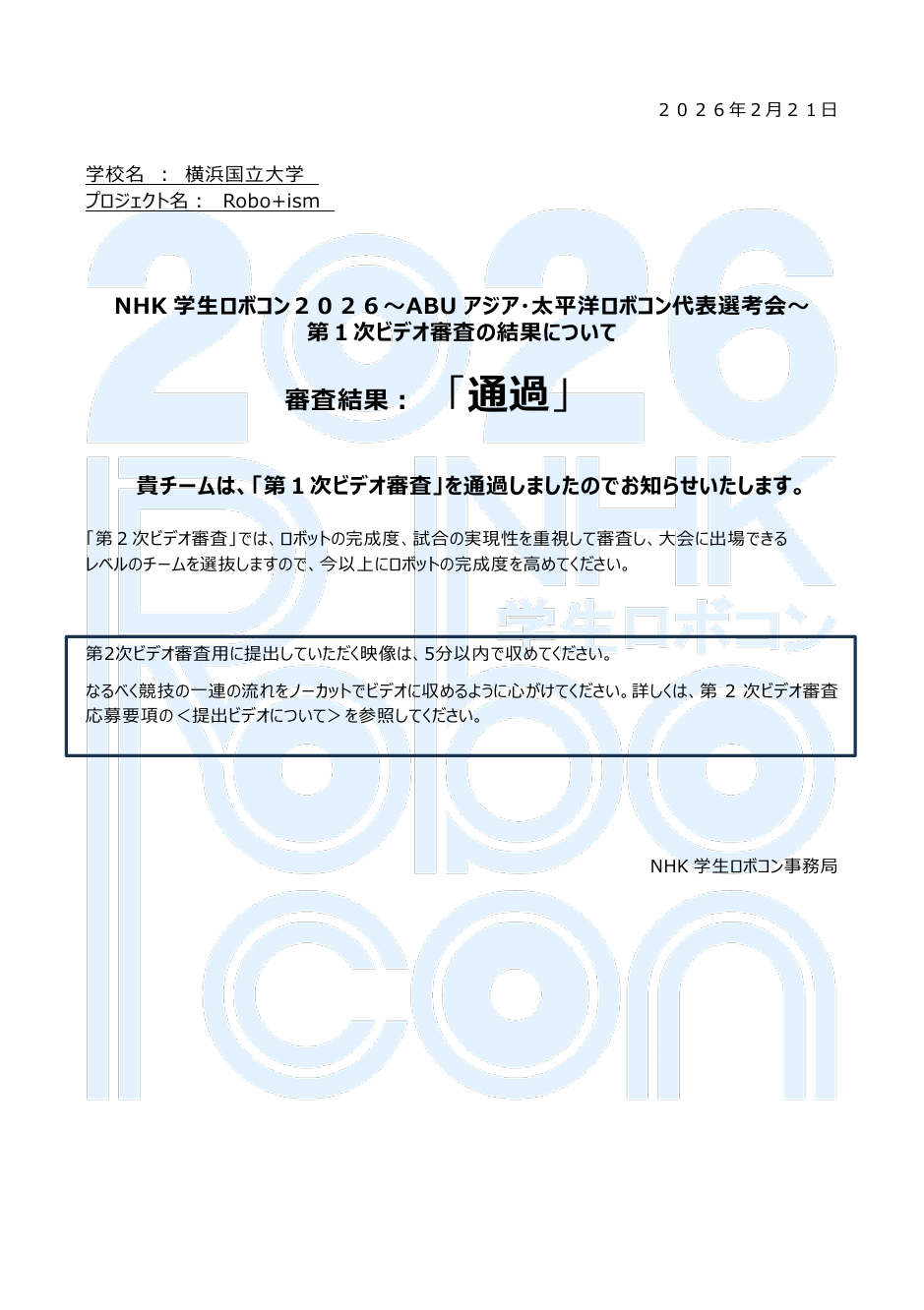 NHK学生ロボコン2026 第1次ビデオ審査通過!